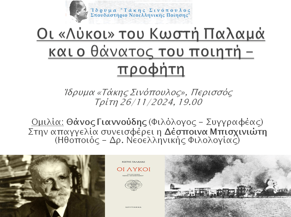 Ο φιλόλογος και ποιητής Θάνος Γιαννούδης μιλά για τους «Λύκους» του Κωστή Παλαμά, στο πλαίσιο της σειρὰς εκδηλώσεων με τίτλο: «Ένα ποίημα – Μια ματιά», στο Ίδρυμα «Τάκης Σινόπουλος – Σπουδαστήριο Νεοελληνικής Ποίησης».