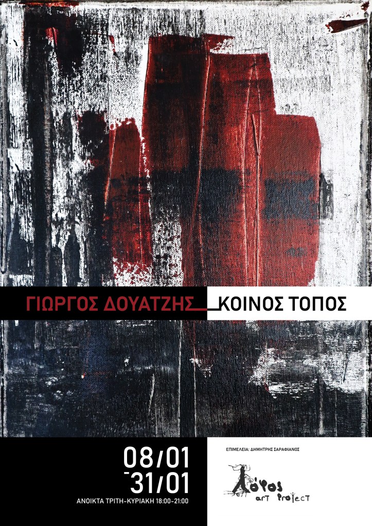 Εγκαινιάζεται την Τετάρτη 8 Ιανουαρίου 2025, ώρα 19.00, στον χώρο πολιτισμού «Λόφος art project», η έκθεση ζωγραφικής, φωτογραφίας, βιβλίων, υπό τον τίτλο «Κοινός τόπος», με τη σύμπραξη της Μάγδας Νικολαΐδου στο πιάνο. Η έκθεση είναιαφιερωμένη στο πολυδιάστατο έργο του ποιητή, συγγραφέα, δημοσιογράφου Γιώργου Δουατζή και περιλαμβάνει έργα αφηρημένης ζωγραφικής (ακρυλικών σε καμβά), φωτογραφίες καθώς και το σύνολο των βιβλίων ποίησης και πεζογραφίας του Γιώργου Δουατζή.